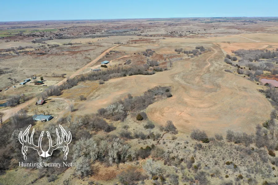 80 acres m/l. Woods County, Oklahoma Hunting Land for sale. Improvements include electricity and water with a 32x64 Machine Shop and a 14x64 open sided lean too. The Machine shop consists of a 200amp electric service, wood burning stove, and the front entryway being concrete followed by the back of the shop consisting of dirt flooring. The sliding doors located on the south side of the shop are 14 tall x 16 wide. Property is a balance of Timber and Cultivation with the cultivated acres on higher ground and timber lined draws running through the property from North to South.
