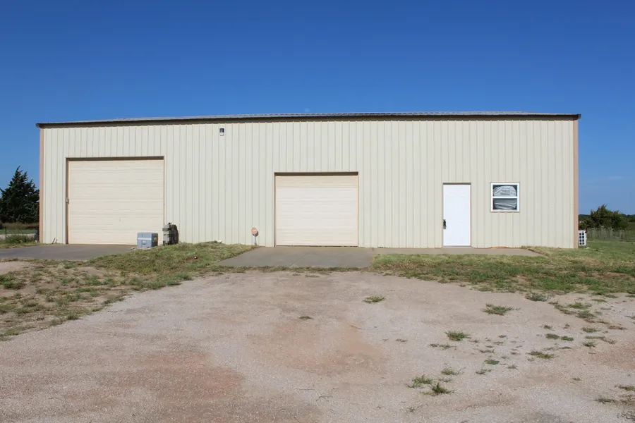 A metal building with small living quarters on 3.25 +/- acres. The living quarters could be an office and has a bathroom with a heating and cooling unit, on rural water and septic system. There is decked storage about the living quarter with a stairway. The building is insulated and wired with three overhead doors. The building is wired with 110 and 220v electricity and two of the OH doors are on auto openers. Windows in the building bring in good light. This is a late model building in very good condition. Located on the outside of city limits, on a rocked road into with a circle drive around the building.