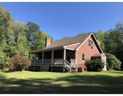 Chalet style home, offering vaulted ceiling and beautiful brick fireplace. Open-concept living, dining & kitchen with nice island for dining or snacking! Woodstove in living room for keeping your home cozy and warm. Two bedrooms downstairs, one upstairs, plus a full bathroom on each floor. Hardwood and tile floors throughout. Enjoy the outdoors on the large front Farmer's porch or the rear deck, both spaces overlooking great yard space! Plenty of parking space for cars, and potential for a garage to be added. Large basement for storage or workshop. Boiler is fueled by oil or wood for options in your energy source!
