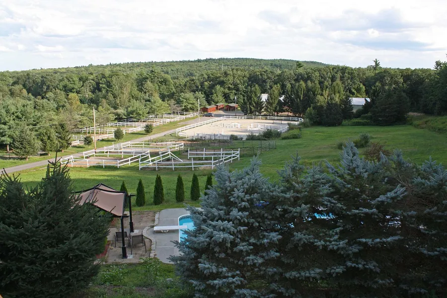 Private 9+ acre equestrian facility with indoor & outdoor riding arena, bordered by MA MDC/MCR protected land. Currently used as a boarding facility, this property is extremely versatile and could continue with boarders, expanded upon or converted for personal use only. The 190x80 building includes an indoor arena, ten (12x12) horse stalls + tack room. Exterior shed-row stalls provide 10 additional stalls that could be moved & reconfigured. Two smaller outbuildings offer the combination of storage, run-ins or additional stalls if needed. Outside, youll find a fenced 100x200 outdoor arena and a total of 14 fenced paddocks. Plenty of open space for parking trailers as well as the option of adding more turnout/paddocks. A split driveway separates the facility from the residence offering privacy. The 4BR, 2BA Cape sits quietly on a knoll offering views of the entire property and beyond. The home features a farmer's porch, country kitchen with granite counters & tile floor, spacious living room with hardwood floor, unfinished walk-out basement and an attached two-car garage. An expansive deck on the back of house overlooks not only the in-ground pool (40' x 16'), but also the equestrian facility located at the rear of the property. All of this is within minutes of Rte 190 making easy access to Worcester and major routes.
