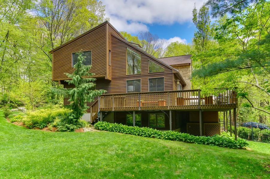 You can have your own Garden of Eden on 2-acres of professionally landscaped, fenced-in gardens. Walk among the beautiful plantings or simply contemplate your good fortune (perhaps with envious friends) from your field stone patio, warmed on cool nights by a fire pit. Or, you can soak it all in from your built-in hot tub on your 600-foot wrap around deck. As you come up your driveway, you'll smile at your stunning contemporary house with its handsome vertical grain cedar exterior. You'll keep smiling inside, where hardwood floors are everywhere & architectural windows provide ample light with rain-sensing skylights. Updates include a modern kitchen with butcher block counters, ss appl. & sliders out to an expansive second deck. The roof and boiler are newer; plus it is wired for 200 amps with a separate generator hook-up. There is plenty of storage & a separate 2-car garage. Only .5 mile...