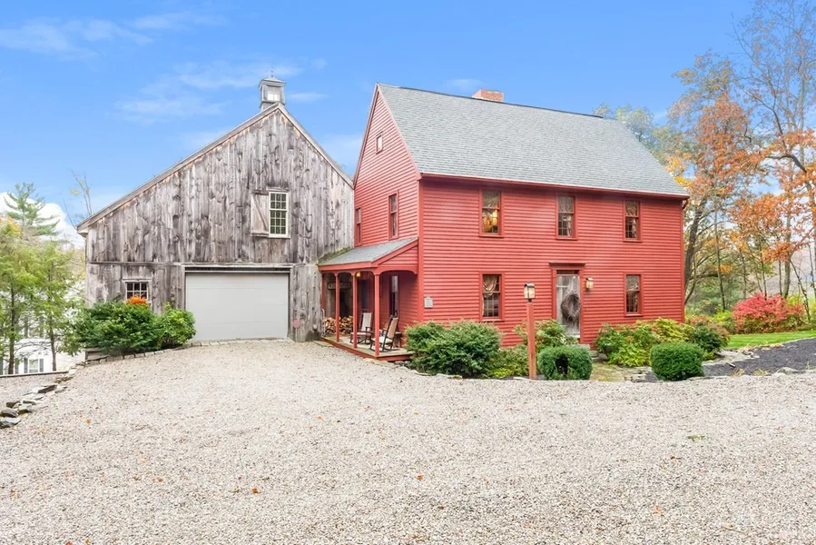 Custom reproduction of a classic New England Salt Box.This example of American colonial architecture is resplendent with charm and character, experience Early American warmth and beauty with modern convenience. Constructed in 1997 this home has been owned by one family who have meticulously enhanced its colonial charm.The main level presents an open floor plan with half-bath, kitchen, dining, living, and bedroom.This space boasts 2 fireplaces, wide pine board flooring, with a beamed ceiling accentuated by a lofted upper level. Upper level contains the master and second bedroom, master bath contains Jacuzzi tub and separate shower. The finished lower level has a huge fireplace, entertainment area, unique Colonial style bar, half-bath and access to lower garage and back yard. Attached 3 story barn/garage has 2 levels that can accommodate 4 vehicles each and ample storage space. Third finished level has heat/ac, with access from kitchen. Detached post & beam barn/garage, great storage.