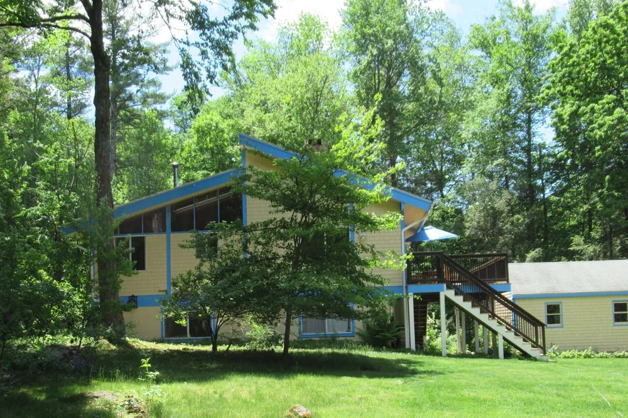 Nestled off a quiet country road, this modern mid-century home, privately situated on 2.39 acres is surrounded by nature's beauty. Mature trees, shrubs and plantings accentuates the spacious yard. Inside, the sun streams through the skylights and sliding glass doors in the connecting living and dining rooms that share a floor to ceiling brick fireplace and cathedral ceilings with access to the large composite deck ~ perfect for entertaining! The first floor features an eat in kitchen with maple cabinets, stainless appliances and a wood stove, a primary ensuite bedroom with a sliding glass door to a private deck, two additional bedrooms and a full bath. The lower level offers another bedroom, full bath, along with an office with built-in bookcases, a walk-in cedar closet, fireplace family room with direct access to the backyard, sauna, and solarium. Additional features include central air...