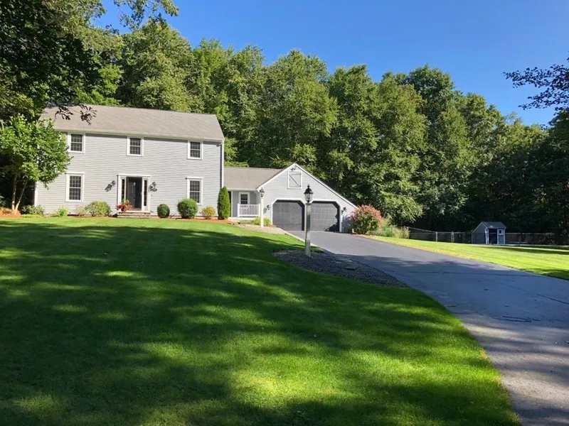 Gorgeous 4 bedroom Farmhouse styled Saltbox on stunning nearly 4 acre secluded lot. First time ever on the market! 2 car attached garage and a second detached two car garage with unfinished room for potential use on second floor. Vacation at home while enjoying the well maintained, beautiful in-ground pool with pool shed for storage and changing. The main foyer welcomes you to a formal living room and dining w/French doors, crown molding, wide pine floors + chair rail. Beautiful newly updated eat-in kitchen w/beam ceilings, large granite island, tons of custom built-in shaker cabinetry, and built-in hutch. Cozy family room w/fireplace, built-in bookcase, wainscoting, beam ceilings, + wide pine flooring. The half bath, office and sunroom overlooking beautiful stonewall and gardens complete the first floor. Second floor master bedroom has walk-in closet and en-suite. Additional 3 bedrooms ...