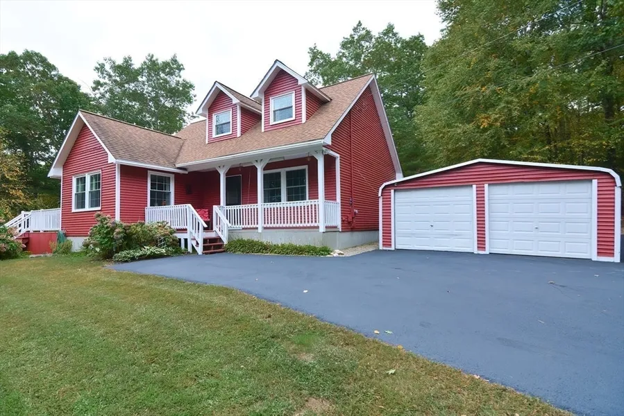 Welcome to this Cape-Cod style home nestled in the woods up a sprawling driveway. Home sits on 2.68 acres of land offering plenty of privacy, parking and a detached 2 car garage. There is a first floor bedroom, full bath and 3 more bedrooms and a full bath on the second floor. The den may be used as a home office, playroom or exercise space. There is propane gas heat. Updates include luxury vinyl plank flooring in the kitchen, dining room and living room. The sunny kitchen was fully updated in 2016 with granite countertops and now has a brand new refrigerator and dishwasher. Nice open shelving for your cookbooks! There is an open window into the cathedral ceiling dining room with French door to side deck. Interior of home painted in 2018 and exterior painted just last year. New hot water heater in 2020. Roof and windows done in 2014. The yard offers beautiful landscaping, a shed, large deck, a patio and deer visits. Title 5 in Hand! Great commuting location to all major routes.