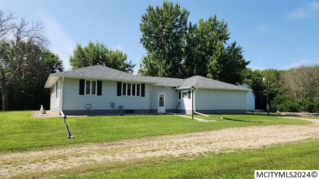 Very nice acreage 6 miles east of Northwood. 2 bedroom, 2 bath ranch home on 7.81 acres. Outbuildings include 2 machine sheds, one smaller equipment storage shed, and a barn. Well maintained ranch home with main level living room, kitchen/dining room, lower level family room, 2 bedrooms on the main, and a lower level office room and a storage room with built in rolling storage racks. Full bath on both main and lower levels. Updated boiler. Wall A/C. Anderson windows throughout. Attached 2 stall garage. New vinyl siding and roof in 2021. New septic in 2024. New furnace in 2023. New well pump 2021. Very tranquil and private setting with a great mature tree grove and set back off Vine Ave. Enjoy the circle drive that circles the home. Country Living at its Best!