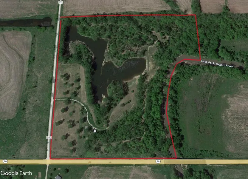 Great recreational and building acreage with river frontage and pond. This property has a little bit of everything. Original use in the 60's was a limestone quarry. The pit has left a nice size pond that is stocked with bass, bluegill, crappie and walleye. East boundary is the East Fork of the Grand River. This river offers pools for fishing or swimming. Being a mostly shallow river you can wade for miles and hunt for Indian artifacts, driftwood and rocks. There is a natural funnel on two sides that offers great deer and turkey hunting. Rural water and electricity are installed on the property. There are two storage sheds and an RV trailer with deck included (RV needs repairs) The owner also has a tractor and implements that can be purchased separately with the property. If you are looking for a nice secluded acreage for building the home of your dreams, weekend get a way, hunting or fis...