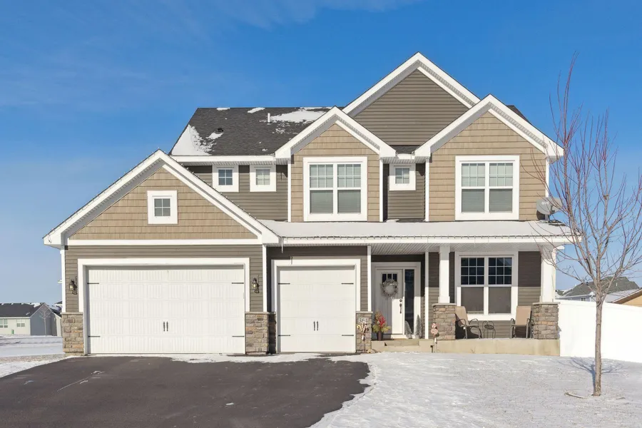 Don't miss out on the chance to live in the acclaimed Delano school district! This stunning home, nestled on a superb corner lot in Highland Ridge, offers an array of remarkable features. Step through the inviting open front porch into the gracious foyer and sunlit office. The open-concept layout encompasses an expansive living room with a cozy gas fireplace, a casual dining area, and a luxurious kitchen boasting custom soft-close cabinets, quartz countertops, and a spacious island perfect for entertaining. Upstairs, discover a second family room, three generous bedrooms, and a primary suite complete with an attached bathroom featuring a dual-headed walk-in shower and ample walk-in closet space. The unfinished basement, with egress windows and plumbing stubbed out, presents an opportunity for the next owner to customize and add substantial equity. Outside, the sizable walkout backyard showcases a grand custom paver patio with a fireplace, bordered by a brand new privacy fence.