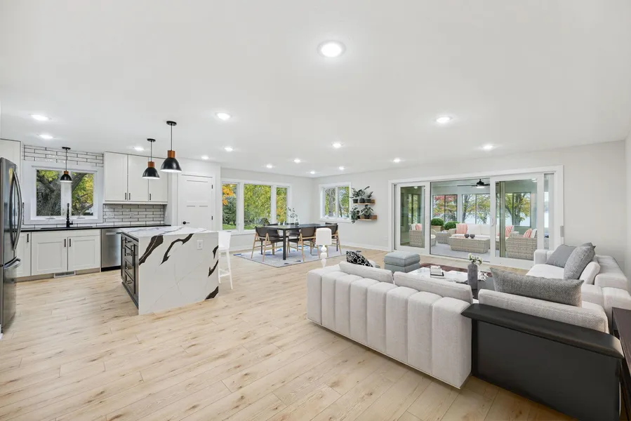 Welcome to a meticulously remodeled dream home, where no detail has been overlooked. This 3BR/3BA gem has been completely renovated from floor to ceiling, ensuring a modern & luxurious living experience. Step inside to discover a spacious interior featuring a stunning kitchen w/granite countertops & a waterfall center island, along w/stainless steel appliances. The elegance continues w/white trim, solid 3-paneled doors, plush carpet & LVP flooring. Natural light floods the living spaces through energy efficient Thermotech windows, including a 10-foot slider that leads to a four-season porch, perfect for relaxation & entertainment. The exterior of the home is equally impressive, w/LP smart siding & vinyl, & a concrete patio ideal for outdoor gatherings. For those who appreciate space for their vehicles and hobbies, this property offers the best of both worlds w/a 2-stall attached garage at the front & a Spancrete garage on the backside. But the true highlight is the 200 ft of lakefront