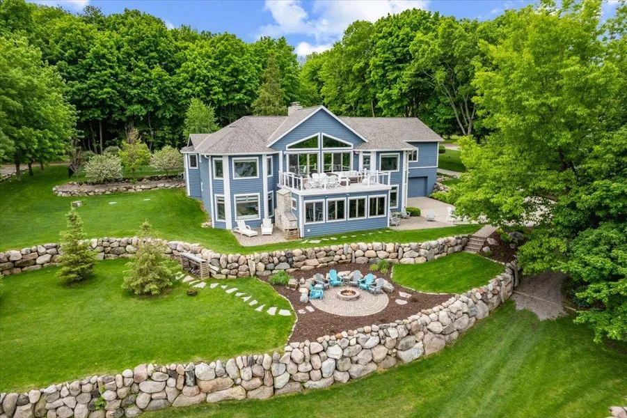 Welcome to your dream home on Cedar Lake! This stunning lakefront property sits on 1.23 acres with 146 feet of sandy shoreline. The main level features tall, vaulted ceilings and expansive windows, creating an open atmosphere that maximizes natural light and offers breathtaking lake views. Walk out to the main level deck and enjoy relaxation while soaking in the sights and sounds of the lake. The chef's kitchen has all of your culinary needs. Features include beautiful granite counter tops, a large center island with breakfast bar seating, a Subzero fridge and freezer, Viking brand range, oven and convection microwave, a walk in pantry, and farmhouse kitchen sink. The main level primary bedroom offers lake views, a luxurious bathroom with free-standing tub, a large walk-in shower, and 2 walk in closets. On the lower level, you have the ultimate entertaining space including full bar, great room, four season porch, bonus room, and 2nd primary bedroom. Plenty of storage space throughout.