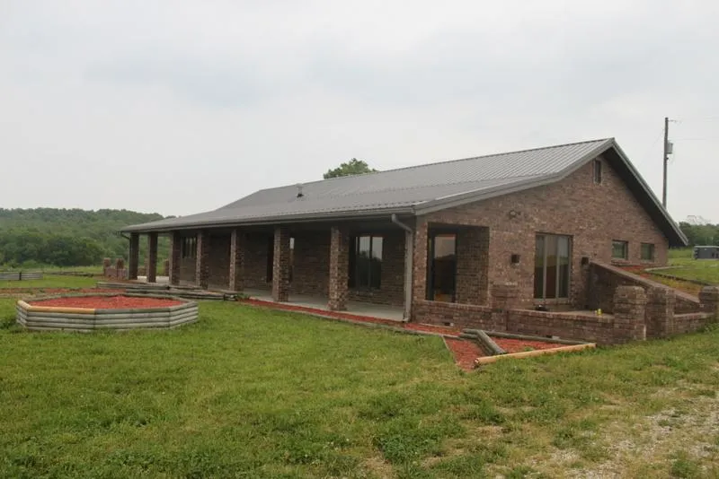 PRICE JUST REDUCED! This basement home has been nicely done! Boasting all brick, w/ covered porch w/ end patios, vaulted ceilings w/exposed beams in the great/living room, tray ceiling & built-in oak china cabinet in dining, many windows for good natural light, new metal roof, along w/ very spacious rooms! There is over 2000 sq. ft. of living space w/ 2 bed, 2 baths, & large mechanics/storage room. Property also offers a shop building w/ attached lean to, pond all on 7 acres m/l. Private with beautiful views!