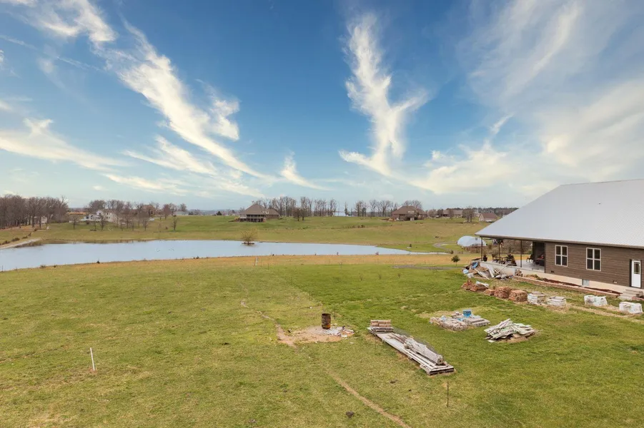 Home on 57 Ac for sale in the Ozarks. Located in the highly sought after area North of town, on paved road with LOCATION LOCATION! The home offers 5500 sq ft and sits up on the hill with HUGE windows for views of your property and almost 4 Ac LAKE! Entering the home you are welcomed by high ceilings, an open living room, dining room and kitchen with a oversized island. The floor looks just like hardwood but is actually tile for easy care and maintenance. The kitchen with custom cabinets and granite counters is perfect for family gatherings. There is also a large pantry for storage. On the main level there are 3 bedrooms, 3 full bathrooms with two additional rooms for an office/sewing room, but could be anything you wish! The upper level offers a large room that could be an additional family room but is large enough for any use. There is a walkway that leads to the loft area on the front of the home with a second fireplace where you will find massive windows with views of your land and lake. The attached 2 car garage on the back of the home has additional work space also. The large front porch wraps around the home on 3 sides and is a wonderful outdoor space. This home is very efficient with a dual zoned heat and air system zoned in 4 areas. The land is fenced and open with some scattered trees. Owner runs cattle on the property and would be perfect for horses or any livestock of your choice. The 4 acre lake is stocked with Bass, Perch and Hybrid Blue Gill. There is also a large spring that runs year around on the property. There is a barn beside the lake for your storage and livestock needs. This is a custom home that is under construction and will be finished by closing. Buyer could have input on finish work with seller. With property only a mile from town there are NO RESTRICTIONS!!! Do what you like with your land, that YOU own! Call to view this amazing property today!