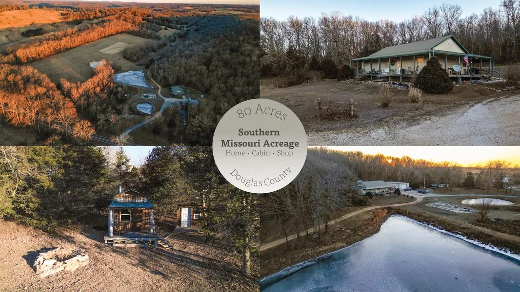 Southern Missouri Ozarks Acreage For Sale with Home, Cabin, and Shop with Living Quarters - Your Dream Retreat Awaits! Welcome to this exceptional 80 acre property, a rare find offering the perfect blend of privacy, comfort, and natural beauty. Located in Douglas County, the property sits 14 miles southeast of Norwood, MO and 18 miles southwest of Mountain Grove, MO. This expansive parcel of land is a true oasis, providing endless possibilities for outdoor enthusiasts, hobby farmers, or anyone seeking a peaceful escape. The well-maintained 1,440 sq ft home boasts an open floor plan with 2 bedrooms and 2 bathrooms. A cozy living room with a wood stove creates the ideal space to unwind after a day spent exploring the land. As you step outside, the expansive wrap-around porch offers a great place to enjoy your morning coffee, host evening gatherings, or simply enjoy a view of both ponds. Th...