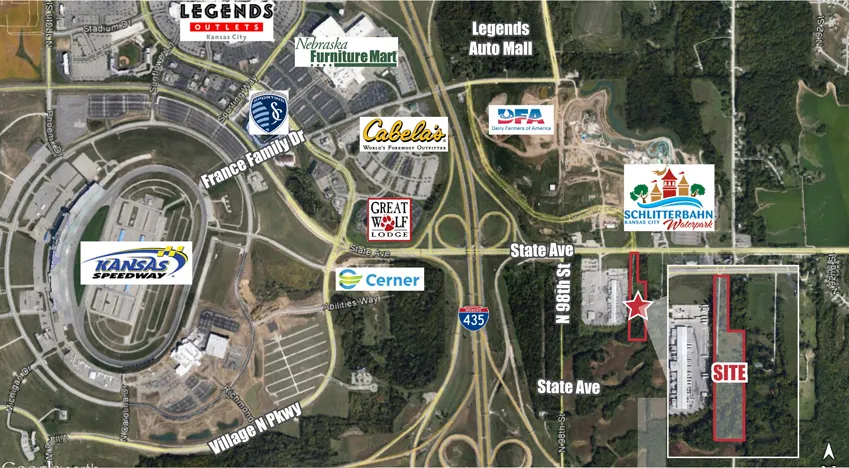 Directly south of Schlitterbahn Water Park and the new road right of way for the relocated 98th Street. Great investment play and or opportunity for development across from the new Village East Development.
