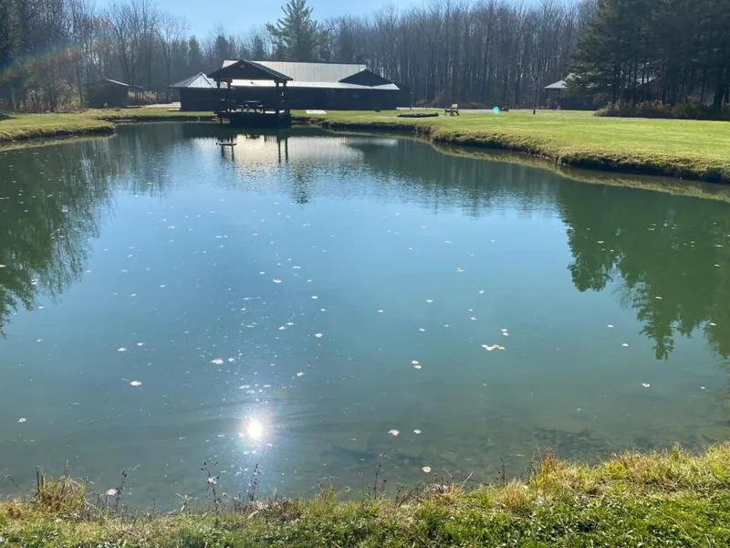 This multifamily property is surrounded by a stand of hardwood trees and pine trees on 21 acres offering both tranquility and privacy at its finest! Take the gated paved illuminated driveway through the trees to a picturesque setting with a spring-fed pond stocked with fish, a dock and a bar gazebo. The first log home features soaring tongue and groove ceilings, hardwood floors, a first floor master ensuite, quest room, second full bathroom, laundry, and an open concept kitchen and living space. The kitchen has plenty of windows, oak cabinets, double oven, and a cooktop. There is a wood burning stove in the living room. Up...
