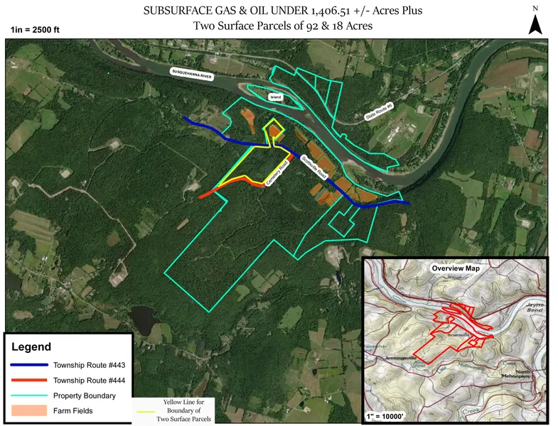 FOR SALE, NATURAL GAS, OIL AND ASSOCIATED HYDROCARBONS (the Subsurface Gas) UNDER 1,406 +/- ACRES IN ONE OF THE HIGHEST NATURAL GAS PRODUCTION AREAS OF PENNSYLVANIA WITH AN ESTIMATED 200 BCF OF RESERVES (200 BCF = 200,000,000 mcf and gas is sold by the mcf). ESTIMATED RESERVES MUST BE INDEPENDENTLY VERIFIED BY ALL POTENTIAL BUYERS AS SELLER MAKES NO REPRESENTATIONS/WARRANTIES ABOUT THE ESTIMATED RESERVES OF THE SUBSURFACE GAS. NEARBY PJM CONNECTIONS FOR DATA CENTERS. SUBSURFACE GAS PLUS ADDITIONAL MARCELLUS GAS FROM NEARBY PIPELINES CAN BE USED TO FUEL A NATURAL GAS POWER PLANT FOR DATA CENTERS ON SURFACE LAND (AVAILABLE SEPARATELY). THE 1,406 +/- ACRES WAS ONE OF SEVERAL SITES PROPOSED FOR A NUCLEAR POWER PLANT IN THE 1970s THAT EVENTUALLY WAS CONSTRUCTED IN SALEM TOWNSHIP, PA THAT IS PRESENTLY OWNED OR OPERATED BY TALEN ENERGY. 1,296 +/- ACRES OF SURFACE LAND IS FOR SALE SEPARATELY. LAND IS OWNED ON BOTH SIDES OF THE SUSQUEHANNA RIVER ALLOWING THE POTENTIAL ALSO FOR A SMALL SCALE HYDROELECTRIC PLANT. SALES PRICE ALSO INCLUDES TWO PARCELS: 1) AN 18 +/- ACRE DRILLING PAD PLUS 2) A 92 +/- ACRE PARCEL FOR PLACEMENT OF PIPELINES. NOTE: A DEED RESTRICTION WILL PROHIBIT NATURAL GAS RELATED APPURTENANCES/EQUIPMENT/FACILITIES ON THE SURFACE OF THE 92 ACRE PARCEL. AN EASEMENT FOR WATER WITHDRAWAL FROM THE SUSQUEHANNA RIVER SOLELY FOR FRACKING AND FLUSHING OF LATERALS WILL ALSO BE PROVIDED. NOTE: A PERMIT TO WITHDRAW WATER FROM THE SUSQUEHANNA RIVER MUST BE OBTAINED BY BUYER FROM THE APPROPRIATE REGULATORY AUTHORITIES. PRICE ALSO INCLUDES PIPELINE EASEMENTS UNDER EXISTING PUBLIC ROADS EXCEPT CEMETERY ROAD. THE 1406 +/- ACRES WAS ORIGINALLY ASSEMBLED UNDER THE THREAT OF EMINENT DOMAIN IN THE 1970's FOR A NUCLEAR POWER PLANT THAT WAS EVENTUALLY BUILT IN SALEM TOWNSHIP, PENNSYLVANIA. LOCATED IN WINDHAM, MEHOOPANY AND MESHOPPEN TOWNSHIPS IN NORTHWEST WYOMING COUNTY, NORTHEASTERN PENNSYLVANIA WHERE NO ZONING PRESENTLY EXISTS.