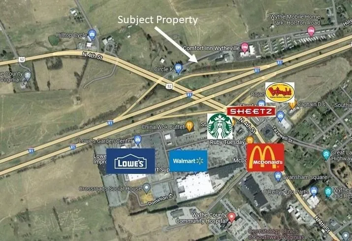 Rare commercial lot listed under tax assessment and available at one of Wytheville's busiest exits where all the action is right off exit 70 from Interstate 81. This is the same exit that has Wal-Mart, Lowe's, Starbucks, Sheetz, hotels and so much more. You can put a restaurant, apartments, a mini mall, doctor's office, just about anything! Zoned B-2, and beside an interstate with an average daily count of 32,000, this land is open to many options. This parcel is situated between a medical facility and a convenience store. Come see why everyone is talking about Wytheville! Schedule your showing today!