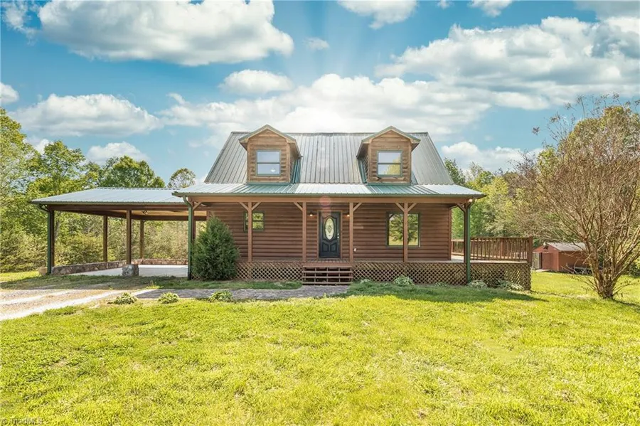 Attractive 1 1/2 story log home with metal roof, on a full basement, situated on 24+ acres in East Bend. Attached 2 car carport with stone accents with entry into the kitchen. Full rocking chair front porch, soaring vaulted ceiling in the Great Room with attractive stone fireplace which is flanked by matching French doors & large windows. Kitchen with island opens to large eat in/dining area. Main level primary suite with a large walk-in closet and a 3rd set of French doors that lead out to the large back & side deck. 2nd full bath on main for guests. 2nd bedroom up with full bath. Many ceiling fans throughout. Finished rooms in the basement for extra space. The land consists of some level, cleared areas and wooded areas for maximum privacy. Come and take a look at this special property, it is ready to call home!