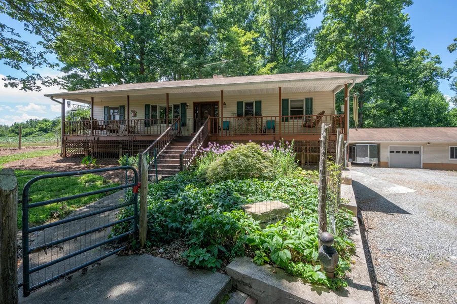 NEW PRICE - Adorable, stick-built home in peaceful, rural setting. Take in the fresh air provided with picturesque view of nature from your front porch! Beautiful wood beams accentuate the vaulted ceiling in living room. Dining room French doors lead to back deck overlooking backyard and nature. Spacious kitchen features lovely tile backsplash and plenty of cabinets for storage. Roomy primary bedroom with large walk-in closet. Need more living area? Basement offers a bonus room, office, and full bath! Basement laundry room has utility sink and cabinets. One car basement garage and 2-car detached garage/workshop has concrete floor and power and offers a bonus feature with multiple opportunities for hobbies or work, plus plenty of storage area. Don't miss out on all this one has to offer!