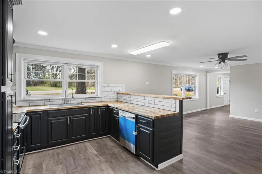 HUGE PRICE ADJUSTMENT!!! Fully renovated 3 BR 2.5 BA home just seconds to Forbush Middle & High School! Have peace knowing that the big ticket items (roof, hvac, windows) have been taken care of. Find 3 bedrooms through the hallway when you walk in. Spacious hall bath w/ new tub-shower, dual vanity, & washer/dryer hookups. Primary Bedroom features en-suite bathroom w/new shower, vanity, barn door, & spacious closet. Two more bedrooms are found down the hallway. Kitchen upgrades include: new butcher block countertops, new cabinets, brand new SS appliances, new sink & fixture. Large bonus room off the kitchen creates additional space for entertaining or dining options. Unfinished basement & garage area allows for great work/storage space. 1.44 acres and just a 25 minute drive to Winston-Salem - Dont let this opportunity pass you by!! Showings begin 3/22