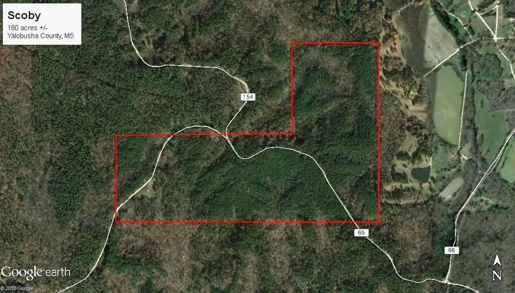 160 acres in Yalobusha County with frontage on County Road 65, adjoining the 20,776 acre southern section of Holly Springs National Forest. The property is 5 miles east of I-55 Exit 220, then east on 330 to County Road 65.