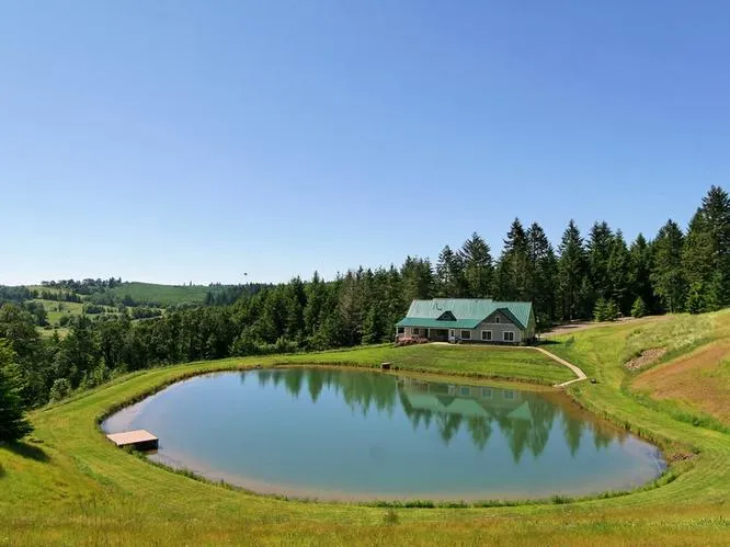 Amazing estate on 45 beautiful acres! Breathtaking destination resort property w/private pond w/dock & stunning territorial views! Gourmet kitch open to vaulted great rm w/river rock fireplace & French drs to lrg covered patio overlooking pond. 3rd bedroom/office could be converted to mother-in-law quarters. See RMLS# 10048367 & 10048369 for additional home & land opportunities.