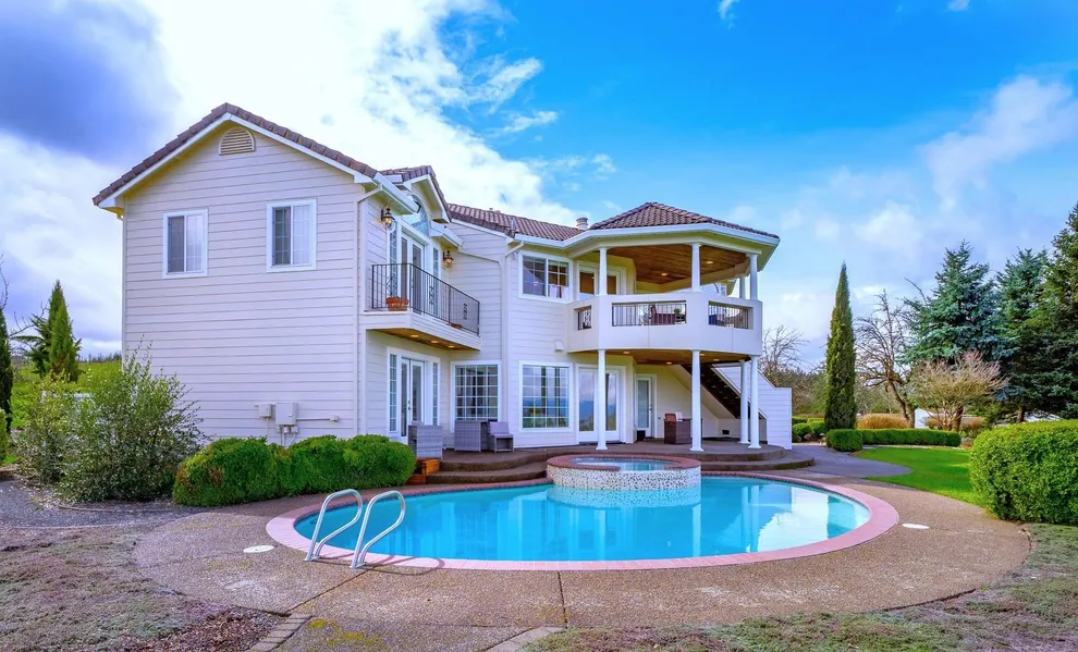 Discover a furnished Vineyard Retreat with Views! Perched above the quiet hills of Amity, this one-of-a-kind estate is more than just a home, it’s a destination. Designed for those who dream of a slower, richer, creative lifestyle, this Mediterranean-inspired retreat offers panoramic views, sunset evenings by the pool, and the chance to craft your own wine right from your own backyard, wine making equipment included. Set on 4.85 scenic acres and zoned AF-10, the estate welcomes you with fresh new siding and paint in March 2025, multiple garage bays (or flexible creative spaces), a sparkling in-ground pool, and a charming gazebo with wood-burning fireplace and pizza oven, perfect for alfresco evenings with friends and family. Every room is filled with light, opening onto covered terraces and balconies that invite you to slow down, take in the hillsides, and enjoy the serenity that only country living can offer. Inside, the spacious layout allows for both elegant entertaining and comfortable daily life. The open kitchen includes a new refrigerator and dishwasher and flows easily into formal and casual living and dining areas. The primary suite feels like a luxury hotel getaway, complete with a private balcony, jetted tub, walk-in shower, and walk-in closet space. Downstairs, guests (or multigenerational living) are thoughtfully accommodated with auxiliary bedrooms and a large living room featuring a wet bar. And the dedicated wine studio? It’s already inspiring its next vintner. The vineyard and cherry orchard are ready for your vision, whether that’s producing your own label, planting new varietals, or simply enjoying the rustic charm they bring to your backyard. If you’ve been craving more space, more sky, and more purpose and the most amazing sunsets, this property is your invitation to dream bigger. Located just outside of McMinnville and Linfield University, it offers a true retreat from the bustle, with flexible living spaces, a legacy feel and room to grow.