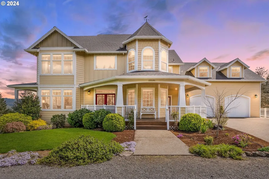Priced to sell! Nestled on high ground in the Dundee Hills AVA, this gorgeous home is 6,000 sqft on 11 acres with sweeping valley and mountain views, 3 pastures, a 40'x22' shop with an ADA bathroom and ADU, separate barn with horse stables and privacy while being less than 10 minutes to downtown Newberg or Dundee. The main home has high ceilings throughout, spans three levels with a wide open floor plan and each level has incredible views. The main level's entryway is grand with an office adjacent, has an open kitchen and living concept, formal and informal dining areas, a see-thru fireplace and woodstove. There are two sets of French doors that lead out to the sprawling deck and undercover space creating an easy indoor/outdoor flow. The upper level evokes a feeling of being on top of the world with an even better perspective of the countryside from the primary suite's balcony or soaking tub. Upstairs has three additional bedrooms and two bathrooms, there is a large bonus/hobby room with ample space and natural light. Downstairs is its own haven with a living space, two bedrooms, a bathroom and full bar equip with a kegerator and tap. A slider leads out to a patio with pavers and a firepit along with stairs that connects to the upper deck. The mature landscaping around the home is both manageable and animated as it changes with the seasons. There are fruit producing trees including apple, plum, cherry, persimmon, peach and pear. The 40'x22' shop has separate living quarters above it with two bedrooms, full bathroom and laundry hookups. The barn has 2 stalls while the interior provides a concrete slab and garage door, is fully insulated, plumbed for hot/cold water and houses a tack room. Outside of the barn is a fully fenced turf area spanning 97'. There is so much to this property and would make for an amazing private estate, animal sanctuary or dog boarding facility all among some of the most amazing wineries, vineyards and views in the world.