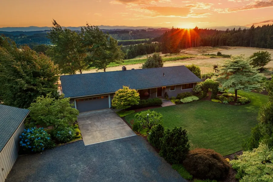If you are seeking exquisite plantable acreage in the heart of Oregon wine country on high visibility winery lane amidst some of the finest wineries & vineyards renowned for producing world-class Pinot Noir, look no further! This top of the hill VIEW home and acreage allows for 15 plantable acres with ideal elevation, slope, exposure and soils! Meticulously cared-for gardens and grounds with one acre of fully manicured landscape providing a serene and picturesque setting. The gently rolling hills and stunning views of the Coastal Mountain Range create an idyllic backdrop for this idyllic property. The home offers easy one level, three-bedroom, two-and-a-half-bath living. The expansive deck allows for relaxation and privacy. A detached garage can easily store additional vehicles, while a metal outbuilding is suitable for farm and vineyard equipment, boats, and toys. Lush gardens make this estate a gardener's dream. The property is a haven for gardening enthusiasts offering vast level land and ideal soil environment to grow everything you need, making it perfect for a self-sustaining lifestyle. Imagine cultivating your own produce, starting a vineyard, or simply enjoying the tranquility and scenic beauty of this remarkable estate. This property truly embodies the essence of living in the heart of Oregon's wine country. Quick access to downtown both Newberg and Dundee. 10 minutes to George Fox University and within 1 hour to the Portland Airport. 10 minutes to Carlton or the Abbey in Lafayette, and 20 minutes to McMinnville. Enjoy this opportunity to begin your winery/vineyard pursuit OR expand on your existing vineyard holdings with a home for your vineyard manager or annual harvest interns! Opportunities abound!