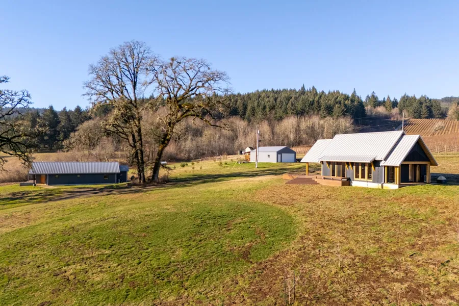 Peace and tranquility is waiting for you in Oregon wine country. Nestled in the foothills of the coastal mountain range, this sublime property will harmonize your soul with nature. Live inspired by the world class views of the green valley, mature vineyards, lush forests and Mount Jefferson. This extraordinary land with 200-year-old trees and gently sloping terrain has to be seen in person to truly appreciate. Three modern, eco-friendly buildings are configured to take in the views in all directions and connect you to nature. The main home features 6ft windows and glass doors opening to deck with a post and beam pergola and four-direction views. On chilly mornings, fire up the glass Danish wood stove that anchors the living area and enjoy the quiet lifestyle of living without any neighbors in sight. Your inner gardener waiting to come out will enjoy the organic raised beds steps from the kitchen. Cook meals at home in your European-styled kitchen, that reflects a simple elegance. This home is an efficient, passive solar building of approximately 1,500 sqft. The second building is a naturally built, retreat-like space of 950 sqft that makes people sigh when they enter and not want to leave. Seven-foot sliders and windows bring down-valley views, including horses in the field below. Natural lath and clay walls, an elegant galley kitchen, a beautiful bath with a Finlandia sauna, and a tongue and groove fir ceiling exude an uplifting experience. Work, create, entertain, hold small group meetings, or practice yoga. A large deck and integrated fire pit bring people together. The third building is a 12x16 gem with a big view, double French doors, corner windows, solid beams, tongue-and-groove ceiling, and fir trim. Run your business, write, paint, study, or use it as a guest room. All three buildings coordinate with board-and-batten siding, metal roofs, Sierra-Pacific windows and doors and Hubbardton Forge lighting fixtures. Bonus 24x35 insulated metal shop and garage.