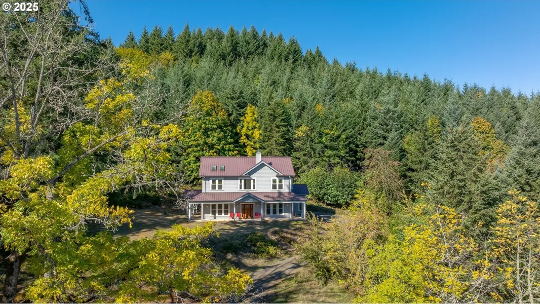 A truly "One-of-a-Kind" home on expansive private acreage and just minutes to McMinnville. This classically built farmhouse (newly built in 2012), blends carefully curated antique pieces with modern conveniences. The kitchen boasts a custom island which incorporates wood/doors from the original homestead & barn and is topped with a Thermador Induction range and pop-up exhaust. Other appliances include a Bosch dishwasher, Electrolux oven and a retro styled "Big Chill" fridge... there is even a 2nd oven, a GE Advantium 220V, which cooks faster than a traditional oven and is a microwave... From the "dual headed fan" to the enameled, cast-iron wood stove with griddle cooktop in the living room, this is the essence of cozy comfort. Claim your favorite seat, view the natural setting and watch the seasons change beyond the generous windows. The office shares the living room's gorgeous view of the valley, and with a certain uniqueness, this room provides an open ceiling and a glimpse to the library above. The closet in the office is proportioned to accommodate horizontal file cabinets and includes a dual outlet for additional office equipment. A striking wood staircase delivers you to a panoramic view of the distant Cascades, including Mt. Jefferson. The Owner's Suite features soaring ceilings, two closets (one walk-in), and an attached bathroom complete with an antique soaking tub and a walk-in tiled shower. The 2nd floor continues with thoughtful touches such as a centrally located linen closet, oversized washer and dryer, a sunny guest bedroom and the entrance to the library. The property benefits from tax deferrals for both forestry and agriculture made up of 25 acres of established Doug Fir and a lavender field. Future owners might consider other crops such as grapes (hobby vineyard), hazelnuts, or a Christmas tree farm to name a few. Buyer to perform due diligence.