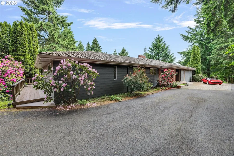 Are you ready for spring in wine country? Experience the best of Oregon's wine country in this stunning 4,781 sq. ft. daylight ranch, secretly situated on 2.6 acres of serene beauty. Use the Virtual Tour link for a 3D walkthrough. With four bedrooms, three baths, an office, and two levels, this home offers a spacious and versatile layout, complete with hardwood floors throughout the main level wrapped in custom handwoven rugs for added elegance. The tile roof adds durability and charm, while the outdoor deck surrounds the house to provide a peaceful retreat with views of mature landscaping and surrounding trees. Likewise the circular driveway surrounds the house and shop, including a permeable paver section near the house, giving two routes of entry and exit. The lower level has an extra bonus room, a fourth bedroom, an office, and a wet bar. A storage/workshop on the same level adds functionality for hobbies or projects. The property is a haven for those seeking both functionality and lifestyle. A detached 40x60 warehouse includes a second 40x20 office and a 40x40 open shop with concrete floors, ideal for small business operations or creative pursuits. The solar array with storage batteries provide essential backup power. Nestled between the award-winning towns of Sherwood and Newberg, this home is surrounded by breathtaking vistas of vineyards, hazelnut orchards, and Christmas tree farms. You will benefit from a Sherwood address yet Yamhill county taxes and Newberg schools. The mature landscaping, enhanced by native plantings, provides year-round beauty and tranquility. At 900 ft elevation, winters transform the property into a snowy wonderland, perfect for skiing, sledding, and peaceful snowshoe walks along quiet neighborhood roads. In warmer months, enjoy cycling to Bald Peak State Park and taking in the spectacular views of Yamhill County. This property is more than a home-it's a destination. Come see for yourself why this is the perfect place to call home.