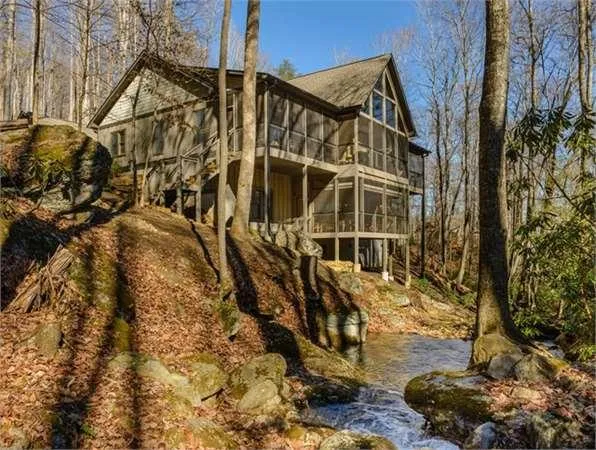 Aloft in the treetops fronting a Class A mountain stream & waterfalls, this custom built 5BR/4.5BA home is on 6 creekfront acres in The Cove at Celo Mountain, a manicured & beautiful gated community east of Burnsville. Vaulted ceilings throughout w/private screened porches overlooking the creek frontage. 3 carpeted bedrooms & 3.5 tiled baths on main floor w/Great Room, hardwood floors, wood burning FP, kitchen island, SS appliances & granite counters. Mountain views to Celo Knob, the acreage spans the creek. Lower level has a spacious family rm, 2 bedrooms, 1 bath & screened private porch w/electric shades overlooking the creek & pools. 2 Car garage w/breezeway to house. Lovely, natural landscaping has stone retaining walls, solid stone steps winding down to the creek and stonescaping.