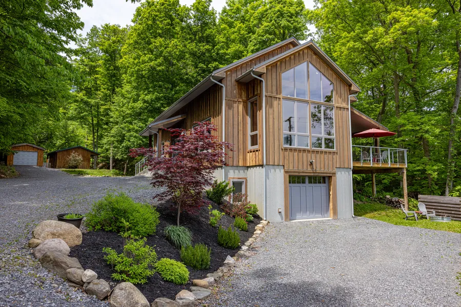 Welcome to a 4200 square foot custom-built home nestled above Keuka Lake. Constructed in 2016, this home is a testament to modern luxury and sustainable living. Powered entirely by solar energy from the nearby Wallace Farms Community Solar Farm, this eco-friendly home is designed to harmonize with its environment. The exterior boasts White Pine sourced locally and milled onsite, while the interior features White Pine accents throughout. Step inside and discover comfort and convenience. The living spaces are thoughtfully designed for both relaxation and functionality. Fujitsu Heat Pumps ensure optimal comfort year-round. The main level features a gourmet kitchen equipped with stainless steel appliances, including a Bertazzoni Stove from Italy and commercial-grade amenities. The central area boasts soaring ceilings, lakeview windows, and a custom concrete bar ideal for entertaining. The loft offers a retreat with a spa-like bath, family room, office space, and private deck with a gas fire pit. Experience sustainable and timeless design in this extraordinary property, where every detail reflects a commitment to quality and environmental stewardship.