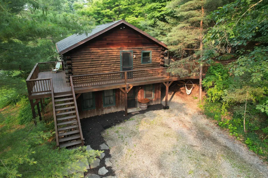 Adirondack inspired log cabin home meets the heart of the Finger Lakes with this year round living retreat. Situated on just over 2 acres and hidden from the road positions this home for privacy and seclusion. Additionally located across from thousands of acres of New York State public land further emphasizing separation from the hustle and bustle. The warm and welcoming open floor plan features a centered kitchen, living room and dining nook for gatherings of all kinds. The uniquely crafted cabinetry makes the kitchen a standout with the custom birch bark detailing with silver metal pin accents. Additionally there is live edge trim on the drawers and the breakfast bar further highlighting the character and distinction of this creative lodge. The moose antler chandeliers, pine log carved railings and wood floors throughout continue to give the space the cabin feel. Beyond the main living space on the same floor is a full bathroom, guest room and an on-suite master bedroom and bathroom. All while the ground level downstairs boasts another bedroom, family room, laundry and storage area. Carefully procured and placed decor (furnishing negotiable) give this home a "in the woods" feeling but conveniently located so close to shops in Naples, restaurants, wineries, wedding venues, breweries, ski resorts and the High tor West River Unit boat launch for fishing and exploring. Outdoors, enjoy the wrap around deck with a private wooded views from every angle. Sit down to an open air dining experience under the custom log built pergola, wired with electric for outdoor lighting to bring the inside out. Warm up next to the outdoor stove further lengthening your outdoor season. Next to the home sits another building with bonus space that could be used as a studio or could be converted into a game room, office or an apartment with a few additions. A large and functional pole barn sits to the east of the home complete with 2 bays for storage. A spot to enjoy all of the seasons New York has to offer including the winter wonderlands, fall mountain views of the rainbow leaves, outdoor fires at a few perfectly placed locations to roast marshmallows in the Summer and on a Spring morning enjoy your coffee on the deck among the tall standing pines. The upland sloping land includes a mixture of trees and foliage and a seasonal waterfall can be seen on the west side edge of the property through the canopy of trees. Join us for the twilight open house Friday July 28th from 5:30pm-7:30pm. Proof of funds or pre-qualification is required with all offers and private showings. Come view this cozy and inviting Adirondack styled home and make it your own.