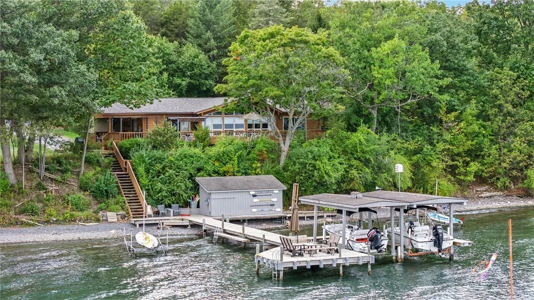 Once in a life time family haven on Seneca Lake! Incredible opportunity to own a heritage property of 3 parcels totaling 15 acres of land, 305 feet of lake frontage and 3 "living" structures. Starting on the water- impressive 3 bedroom year round home with 2 full bathrooms- full of character and meticulously maintained throughout. This on-the-water ranch style home has large decks overlooking permanent dock with 2 covered boat hoists, boat house, and impressive beach with impeccably private views. Additional seasonal cabin has full kitchen, covered porch, living room and full bath. Large 2 car garage with extra tall doors, storage for maintenance and lake front toys. Additional bath house has full bathroom and sleeping quarters! Lush gardens and woodsy trees provide many places to unwind and escape away in peace and privacy. The setting is unlike anything you will find! Pride of ownershi...