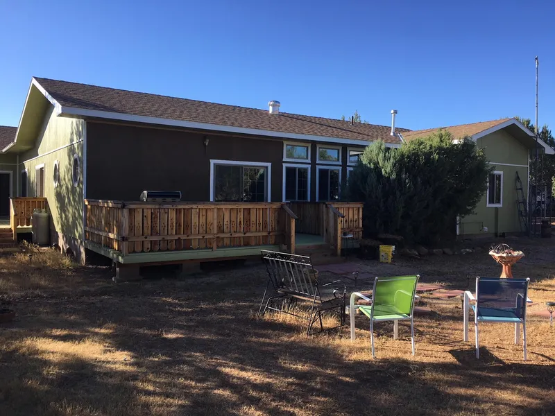 37526 W Howling Coyote Rd. Magnificently GRAND Custom built home; two huge master suites, and a gigantic great room with a formal dining area, a perfect place for a pool table or a grand piano; this off-grid property is built for a forever home, designed for entertaining or escaping from the hustle and bustle of the real world. The house wraps around an outdoor patio that is fully fenced and very inviting. The Living areas have walk out decks on the East and South side of the property. There is a small area between the house and shop fenced for pets. The very large oversized 4-6 car garage has the beginnings of a bunk house or guest house in the garage the possibilities are endless a very comfy man cave or arts and craft studio or let your imagination make it anything you want! The grounds are fully fenced, heavily treed, mostly flat with some undulation for personality. The view thru the trees is VERY inviting and the grounds themselves are a serene setting. Walk the labyrinth to get back in touch with your inner self. The definition of Labyrinth is to create calm compared to the definition of a Maze where the purpose is to confuse. This property is perfectly suited for horse property as the ground under the trees is sandy soil and you will have a bit of grass in the spring and fall. Also perfect for creating an orchard for cold weather fruit trees or nuts. Only 9.5 miles of gravel coming in from the North (off of I-40) from exit 103 (Jolly Rd) or 11 gravel miles from exit 109 (Anvil Rock) but 6m of the 11 are county maintained and a 45mph gravel rd. Off-grid set up with both propane heat and a fire place, a decent size solar system and the Seller is willing to upgrade the batteries prior to closing for the right buyer. Must have an appointment do not just show up without one!