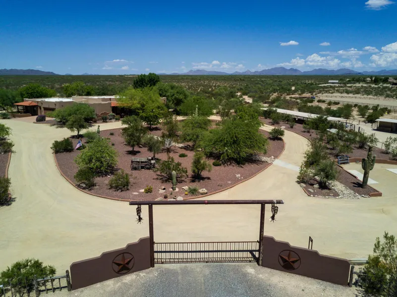 Outstanding Equestrian Estate nestled on over 8 acres with breathtaking Mountain Views on flat land in private setting. Unique custom Home with mother-in-law suite, separate 900 sqft casita, RV shop/hookup, 4 car garage, arena w/sprinkler system, 8 horse stall barn with hook ups & so much more. Sparkling pool w/slide, shade trees, dining patio, built-in BBQ, & covered patio. Charming courtyard entry, wood beamed ceilings, soothing palette, and fireplace. Granite kitchen counters, center island, skylights, and Den. This is an extremely rare opportunity to own perfection in Horse Country as property sits next to several square miles of BLM. The INCOME this property generates is like getting paid to live in a South Western paradise