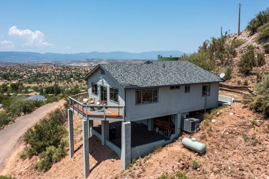 Discover tranquility in this charming two-bedroom, two-bathroom house nestled in picturesque Rimrock, Arizona. Boasting panoramic views that will take your breath away, this property offers an unparalleled sense of privacy on its generous lot. The spacious 160 square foot deck provides the perfect vantage point to soak in the stunning vistas and entertain guests. Recently updated with modern amenities, this home features waterproof cork bottom luxury vinyl plank floors, a brand new heating, ventilation, and air conditioning system, and new appliances throughout. The newly installed roof ensures peace of mind, while the electric charging station adds a touch of eco-friendly convenience. Golf enthusiasts will appreciate the garage designed for a golf cart, with the option to purchase.