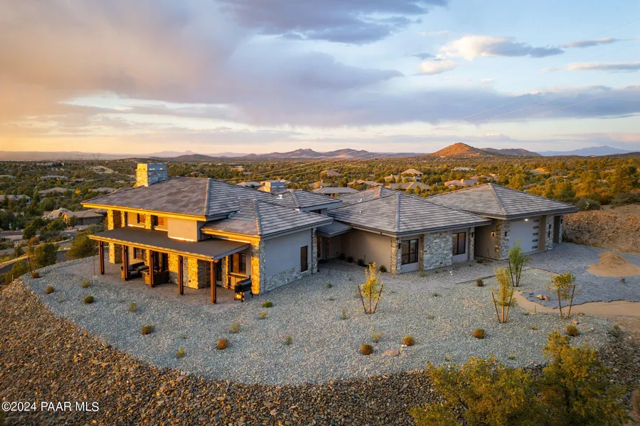 Truly one of the more magnificent homes in the entire community of Whispering Canyon and the Williamson Valley area. Perched atop a level 1.97 acre mountain ridge with sweeping and dramatic long distance views this home makes a statement. Single level residence with 5 Suites, 5.5 bathrooms, an oversized 3.5 car garage, patios for outside entertaining and plenty of space for storage. Features include beamed ceilings, Porcelain tile flooring, real stone accents throughout, ''Milgard'' clerestory windows, power blinds, two fireplaces, premium built-in appliances and Wine Cellar. Mountain modern finishes throughout the home add a touch of contemporary elegance, while every window strategically captures a picturesque view. Professional landscaping in front & back with drip systems.