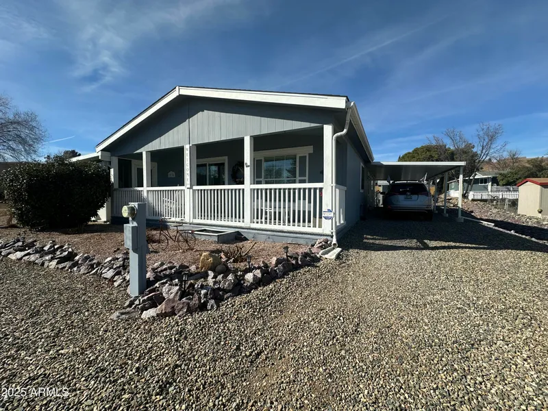 Welcome to your dream home in the heart of Dewey, Arizona in prestigious Prescott Country Club Mobile Villas! This beautifully upgraded manufactured home features 2 bedrooms, 2 baths, and a versatile den that can easily serve as a third bedroom. The country kitchen boasts corian countertops, stainless steel appliances, gas range, built-in microwave, pantry, skylight, and an abundance of cabinet & counter space! Elegant vaulted ceilings! An open, spacious formal dining room adjacent to the family room with a cozy gas fireplace! Full guest bath with a skylight (installed in 2024 when the roof was replaced)! The convenient inside laundry room has a skylight for added brightness! The large master bedroom has plenty of natural light, a ceiling fan, and a private patio door to the charming backyard! The luxurious master bath features a spacious shower stall with seating, double sinks, and a high-end bidet with temperature control, pulse, turbo, drying & oscillating features! Comfy sitting area has lots of extra storage for Comforters or extra bedding! The expansive 18x30 Arizona room is perfect for entertaining or relaxing with plenty of room for everyone! Tempered glass windows with sunscreens for energy efficiency! The pristine outdoor oasis features a 6-7 person Evolution Acrylic Spa with built-in stereo, Bluetooth, 90 jets, LED cup holders, a stunning water wall, interior & exterior LED lighting, and a cooling boost feature for hot days as the temperature rises! There is more than sufficient storage with a 12x24 WeatherKing shed that makes a wonderful workshop or mancave and a 10x12 Tuff Shed! Enjoy a prime location that is nestled in a beautiful subdivision with breathtaking mountain views! This incredible home has everything you need and more! Don't miss your chance to own this gorgeous property in Dewey, AZ!