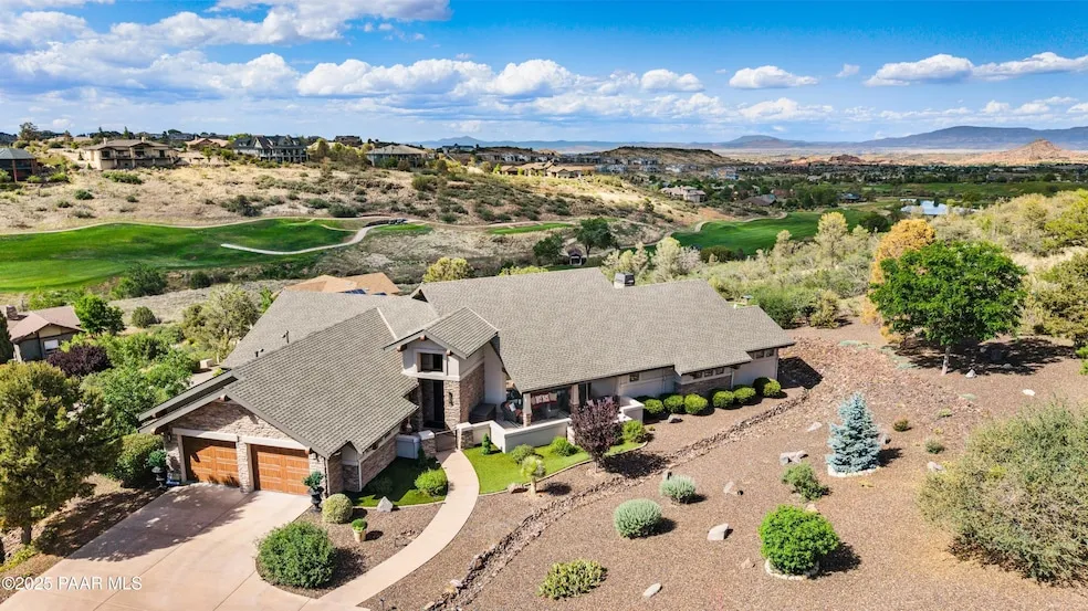 Custom home in The Estates at Prescott Lakes offering panoramic views of the 4th hole, Granite Dells, San Francisco Peaks, Granite Mountain, and Thumb Butte. Private 1.26-acre lot creates a resort-like setting ideal for entertaining. The kitchen boasts granite counters, a large center island, ample cabinetry, and a butler's pantry with extra storage. The Primary Suite offers a gas fireplace, sitting area, spa-like ensuite, and large walk-in closet with custom cabinetry. A second bedroom functions as a 2nd primary suite, with its own patio and ensuite. The large den/office can easily convert to a 3rd bedroom. An oversized 2-car garage includes wall-to-wall built-in cabinets, sink and room for 2 SUV's and a golf cart. This move-in ready home offers everything upscale homeowners desire.