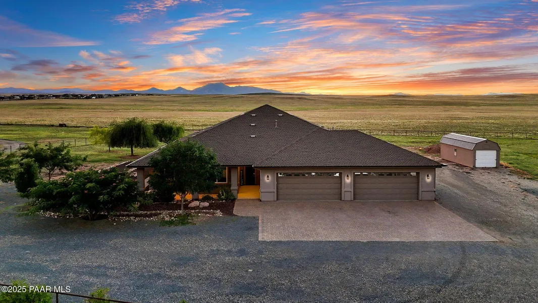 Situated on 2.5-acre lot in the serene landscapes of Prescott Valley, this stunning 4-bedroom, 4-bathroom home offers both luxury and privacy. This property boasts a spacious 2742 sqft of living space, 2nd and 3rd bedrooms have their own ensuite and walk-in closets. meticulously designed to cater to a comfortable and stylish lifestyle with extensive outdoor living space and firepit. As you enter the property, you are greeted by the luxurious touch of matt-finish marble countertops that adorn the kitchen and bathrooms, complemented by top-of-the-line KitchenAid stainless steel appliances. The home features durable LVT flooring throughout, blending durability with aesthetic appeal. The expansive living area is perfect for family gatherings and entertainment, seamlessly transitioning into an open kitchen area that invites culinary exploits. Each bathroom is finely appointed, ensuring private comfort for residents and guests alike. This home includes an oversized 4-car garage, with two 220 V outlets along with a dedicated freezer circuit. Additionally, a 12x32 shed with a roll-up door offers extensive additional storage or workspace possibilities. Outdoor living is equally impressive with a property that backs onto open ranch land, offering unobstructed views of Granite Mountain and a sense of boundless nature. The perimeter is fully fenced and features an electric gate for added security and convenience. Nearby, just a short drive from the home, Viewpoint Park provides a beautiful setting for outdoor recreation and relaxation. Rarely does a blend of convenience, privacy, and luxury come together so seamlessly. This home is not just a residence; it's a retreat from the everyday hustle. Ideal for anyone seeking a peaceful, upscale living environment, it awaits to welcome you to your new sanctuary. Experience this exceptional offering and make it your new home, where every detail ensures comfort, security, and style.