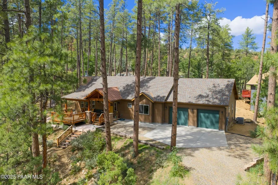 Escape to the pines in this meticulous home nestled in the highly desired Dearing Park Community of Prescott. Featuring an open floor plan creates a warm & inviting living space, with Brazilian maple hardwood floors, 14' vaulted pine tongue and groove wood ceilings, gas or wood burning fireplace with stone and wood mantel for accent complete with a desk area, Great room has expansive windows that feels like a breath of fresh air, light, open, and uplifting, it's a living space that truly elevates everyday living. Open concept kitchen w/center island, seamlessly connects to the great room, creating a unified space for cooking, dining and relaxing. This concept creates a flow to the front and back decks where you can relax among the tall Ponderosa pines a perfect spot for morning coffee, afternoon reading an invitation to slow down and connect with the outdoors. The property borders Prescott National Forest offering privacy, wildlife and endless outdoor adventure right from your backyard. Enjoy the benefits of 1.28 acres of land, providing privacy and space to explore, hike and enjoy the outdoors complete with a highly crafted 2 tier treehouse that offers a secluded escape. This home blends comfort, charm and the beauty of nature providing a quieter residential lifestyle to unplug, unwind, and reconnect with the surrounding whispering pines. Bring the horses there are horse corral panels that blend seamlessly into the forested landscape with great proximity to trails and scenic rides. A seasonal creek runs through the property, offering the peaceful sound of running water during the wetter months and a beautiful, natural setting year-round. All the beauty of nature while close to Prescott's downtown amenities this home offers the perfect living lifestyle.