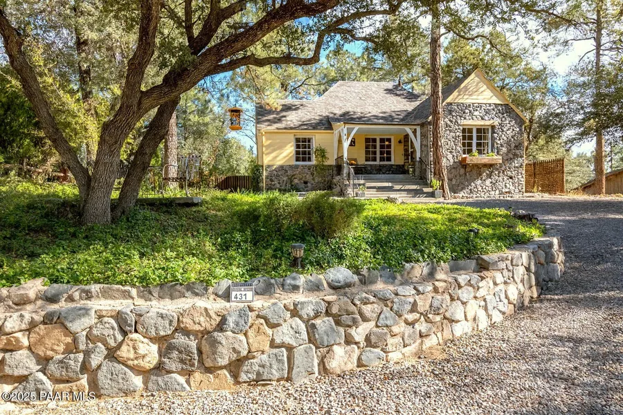 Nestled beneath towering pines and oaks in Prescott's historic district, this 1925 cottage blends timeless charm with a coveted walk-to-town location. The stone-front facade, rock walls, and covered front porch set a storybook tone. Inside, original hardwood floors, a plaster fireplace, vaulted beamed ceilings, and French doors capture vintage elegance. The kitchen pairs historic tile with stainless steel appliances, and the single bath features lace tile flooring and period details. Outside, enjoy a deep 0.26-acre lot with a paver patio, detached garage/workshop, and total privacy under the trees. Just minutes from Courthouse Square, this 3-bed, 1-bath gem is ideal as a second home, artist's retreat, or peaceful full-time residence in one of Prescott's most walkable neighborhoods.