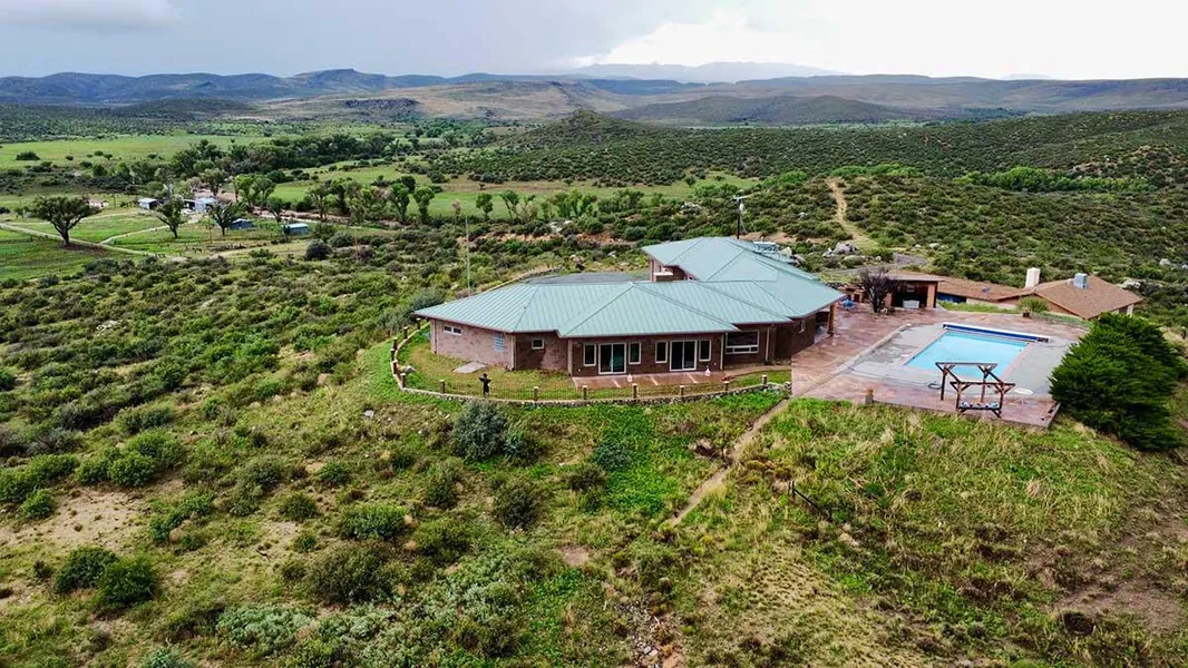 The property includes three houses and a bunkhouse, making it ideal for a multi-generational homestead, guest retreat, or working ranch operation. The 2,900-square-foot main house, built by John Barenz in 2012, sits atop a hill and offers four bedrooms, three bathrooms, a luxury swimming pool, and panoramic views.