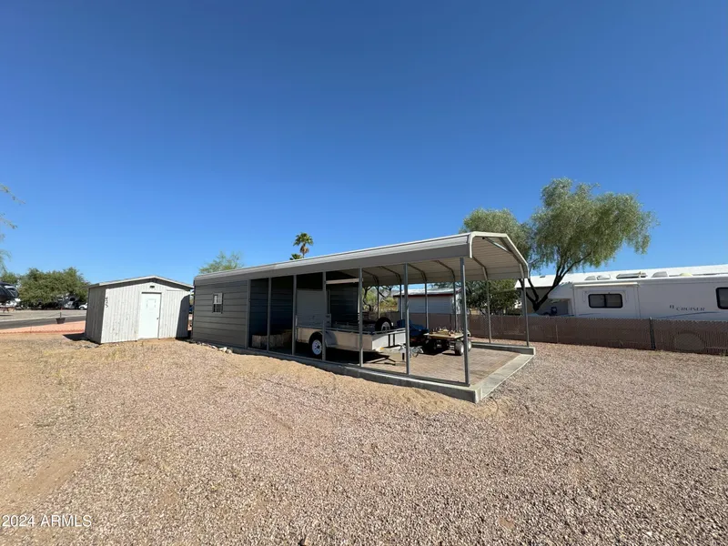 Located on a spacious corner lot next to a common area, this improved lot offers a new workshop/garage with built-in shelves and work bench, an attached carport with pavers, and RV hookups, making this an ideal retreat for winter visitors and full-timers alike. The property also includes a shed for extra storage. Come check out this unique, versatile lot before it's gone!
