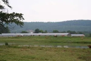 Broiler farm on 57 acres with 2 40X400 broiler houses. Wayne farms contract. Approximately 3 1/2 acre lake with 2 natural springs, 1 pond, and 1 creek. City water. Barn, and storage building with electric. Some minerals convey.