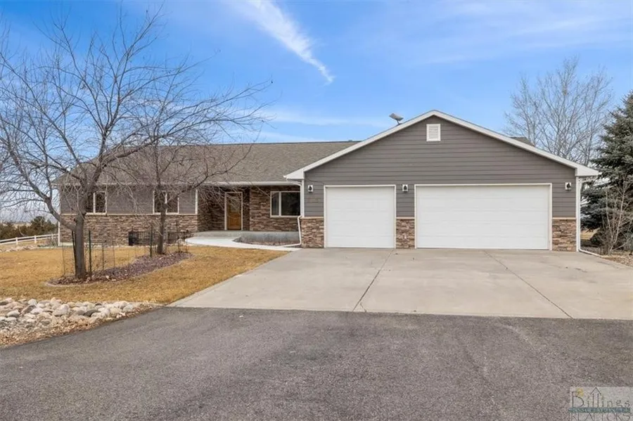 This exquisite home is move-in ready, situated on two acres, offering ample space for a workshop. Nestled in a countryside setting, it boasts views of Billings and the encompassing mountain ranges. Inside, vaulted ceilings in the living room, enhanced by recessed lighting and a gas fireplace. The newly renovated kitchen is expansive, featuring an open floor plan and custom cabinetry. Adjacent to the kitchen is a formal dining room, complemented by a convenient pantry. The master suite impresses with its lofty ceilings, a private bath, and a walk-in closet. Descending to the basement, a sizable family room is ideal for hosting gatherings with access to the outdoors via a sliding glass door. Outside, ample parking is provided alongside a spacious 4-5 car garage. Enjoy outdoor living with a wrap-around Trex deck, enclosed back patio, and a charming front porch adding to the home's allure.