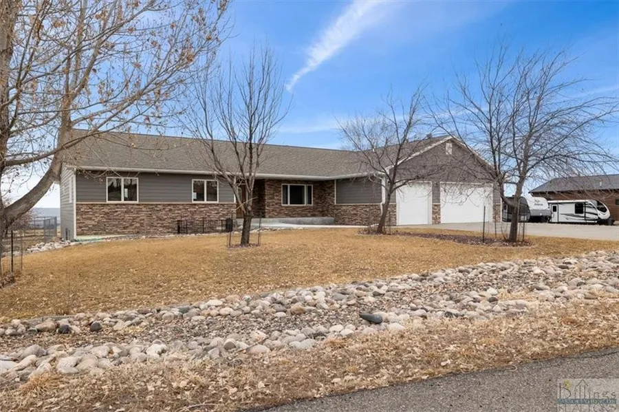 This exquisite home is move-in ready, situated on two acres, offering ample space for a workshop. Nestled in a countryside setting, it boasts views of Billings and the encompassing mountain ranges. Inside, vaulted ceilings in the living room, enhanced by recessed lighting and a gas fireplace. The newly renovated kitchen is expansive, featuring an open floor plan and custom cabinetry. Adjacent to the kitchen is a formal dining room, complemented by a convenient pantry. The master suite impresses with its lofty ceilings, a private bath, and a walk-in closet. Descending to the basement, a sizable family room is ideal for hosting gatherings with access to the outdoors via a sliding glass door. Outside, ample parking is provided alongside a spacious 4-5 car garage. Enjoy outdoor living with a wrap-around Trex deck, enclosed back patio, and a charming front porch adding to the home's allure.